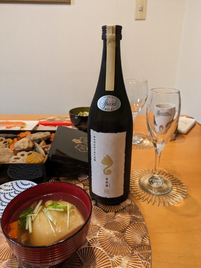 おせちのお供は新政の亜麻猫スパークにしました。