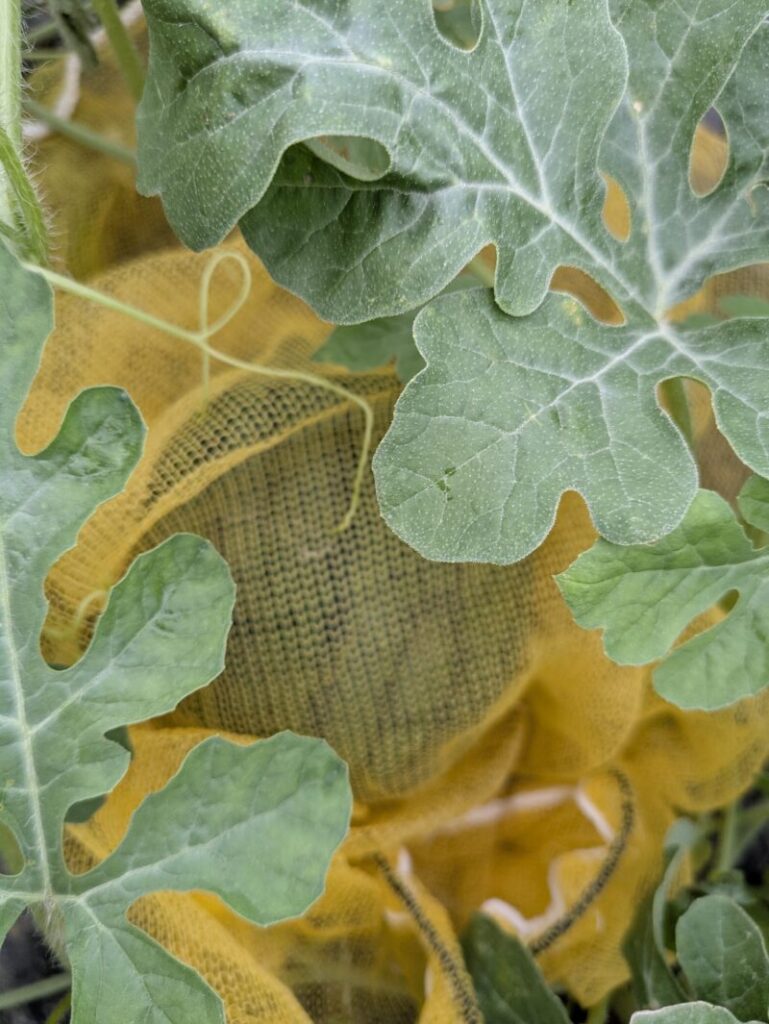 ピーマンにツルを絡めてぶら下がろうとしている、ちょっと恐ろしいスイカ。