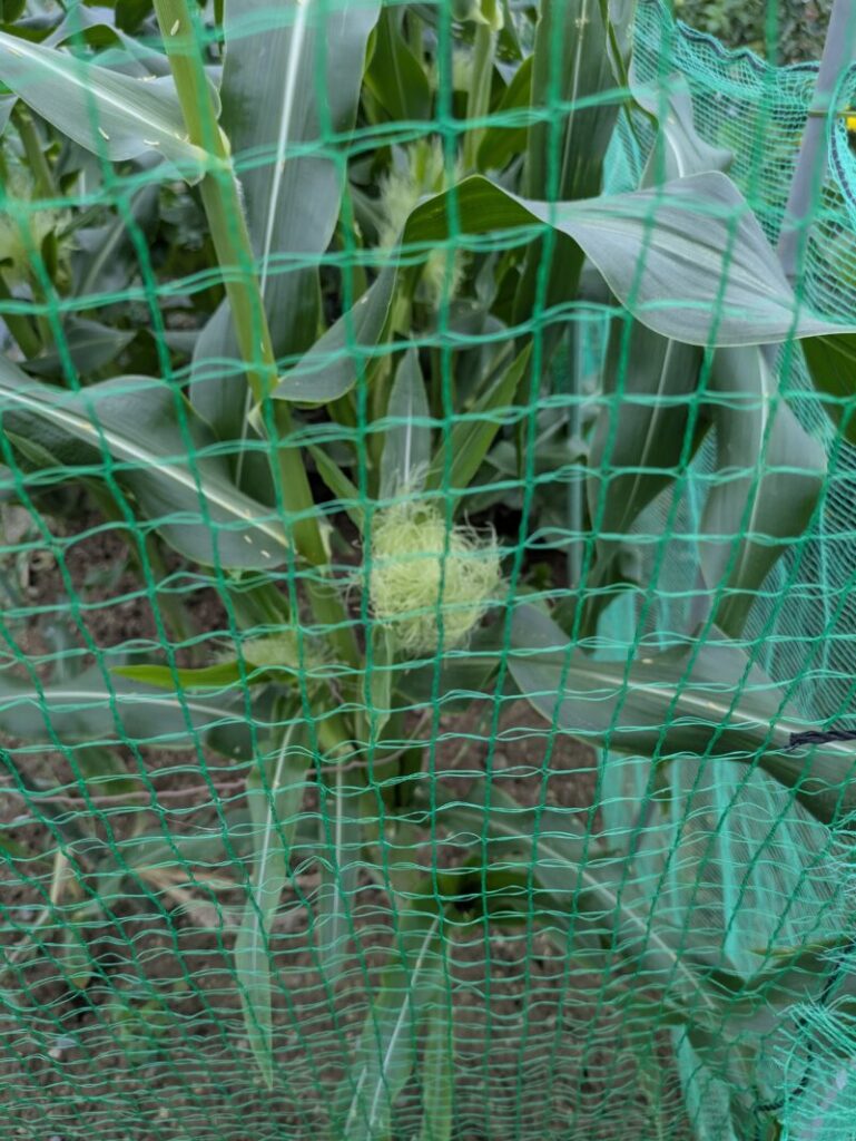 トウモロコシをネットで囲う