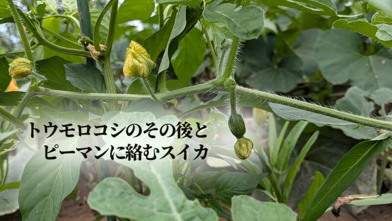 そして今、元気すぎるスイカがピーマンに絡んでいます。
