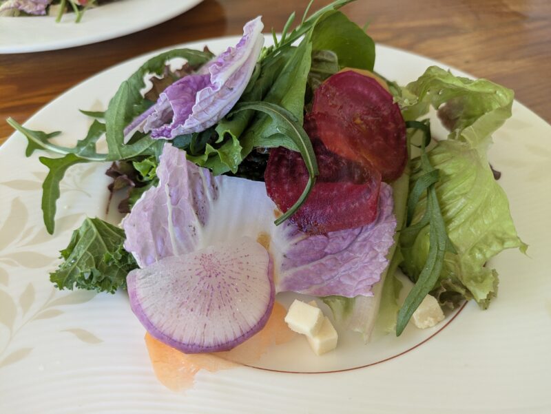 手作りのドレッシングが下に敷かれていて、野菜はどれも新鮮。味も見た目も満足の一皿でした。