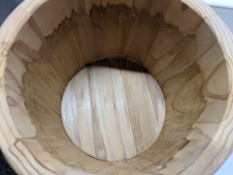 使用前に熱湯を回しかけると、湯気と一緒に杉の香りに、ほんのり味噌の香りが混じったような、なんとも言えない良い香りが立ち上がりました。