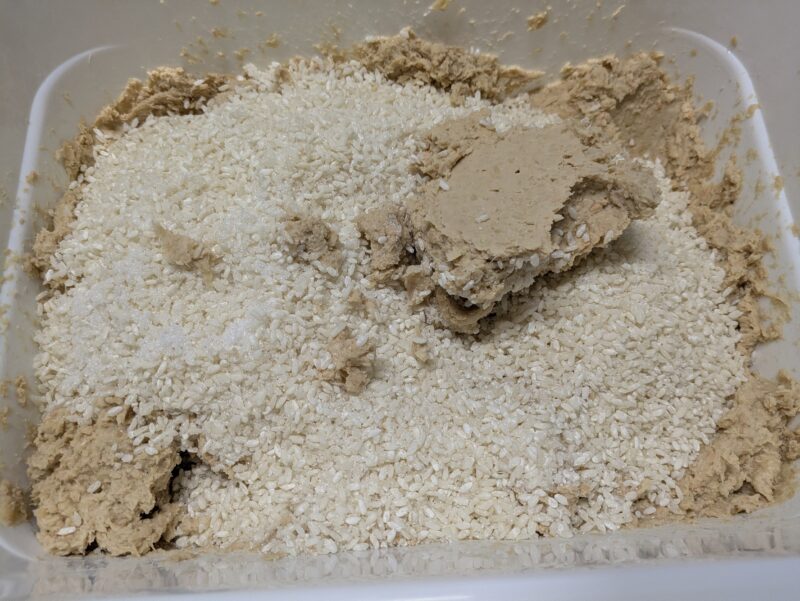 潰した大豆に、塩を混ぜた麹を加え、全体が均一になるまでよく混ぜます。