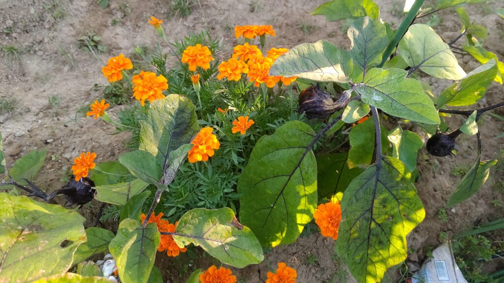 Eggplant and marigolds