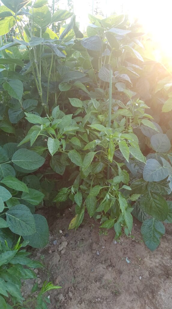 When I checked on the peppers, I noticed that the edamame had grown so vigorously that the peppers were now completely in the shade.