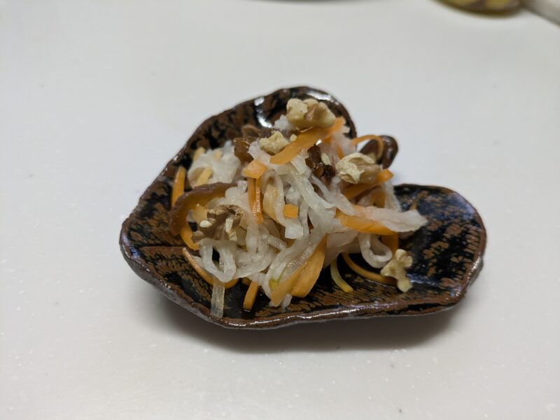 - 大根とにんじんを合わせ酢に漬け、干し柿とクルミを加えて全体を和える。