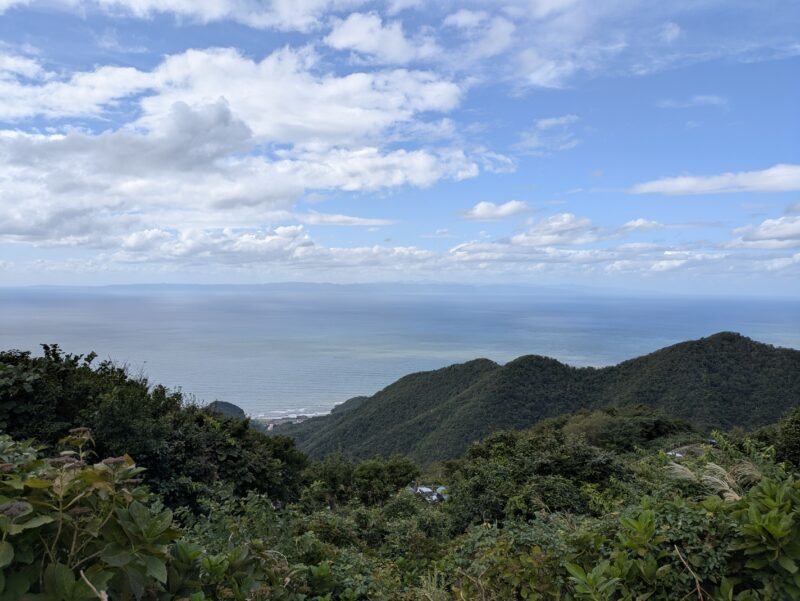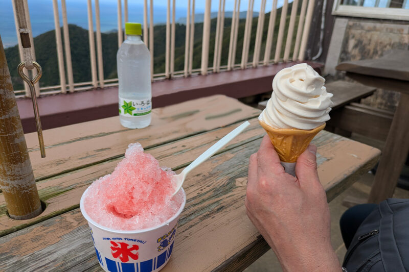 山頂から見える佐渡島。空と海の境界が美しく、思わずソフトクリームとかき氷を。