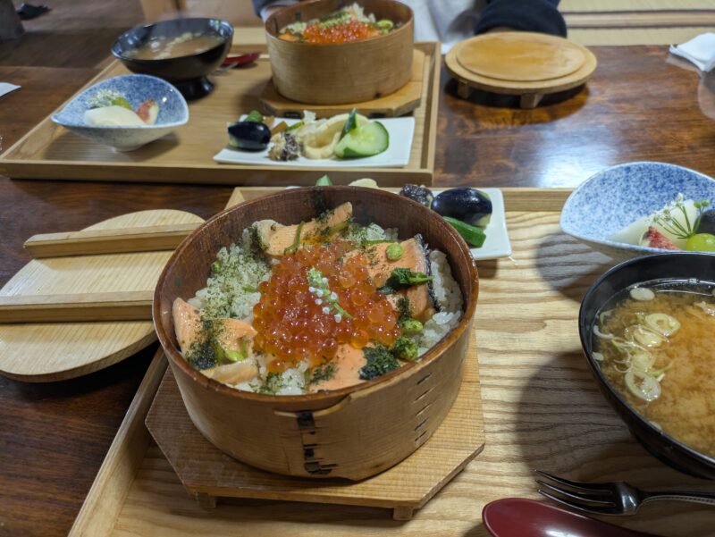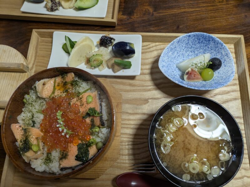 いくらたっぷりのわっぱめしとゴーヤの酢の物などのお漬物、季節の果物、どれもおいしかったし店員さんもにこにこしていて親切でした。人気のわけです。
