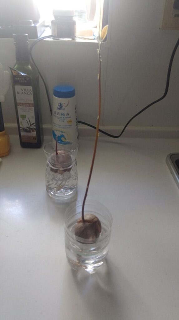 水の中でぐんぐん伸びて、日当たりが悪くて伸びすぎちゃったアボカド。