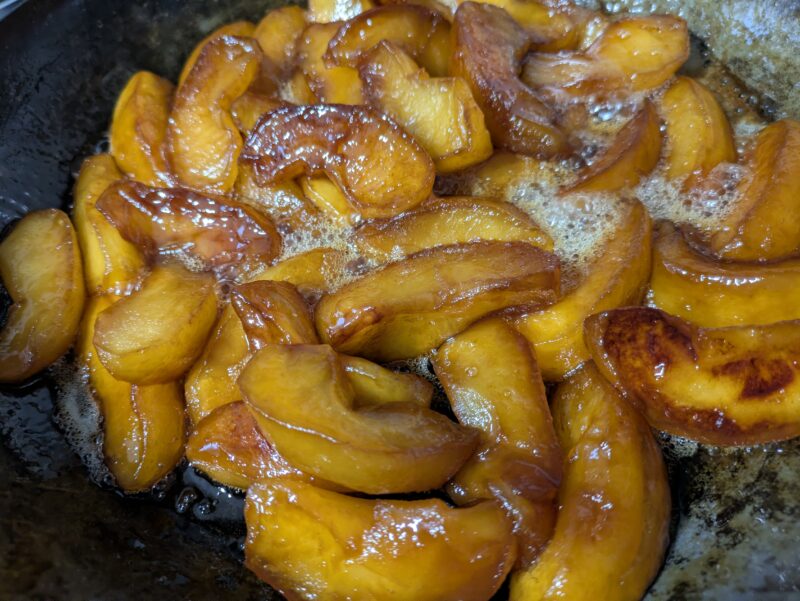 フライパンに砂糖と水大さじ1(分量外)を入れ、中火で濃いめのキャラメル色になるまで加熱。