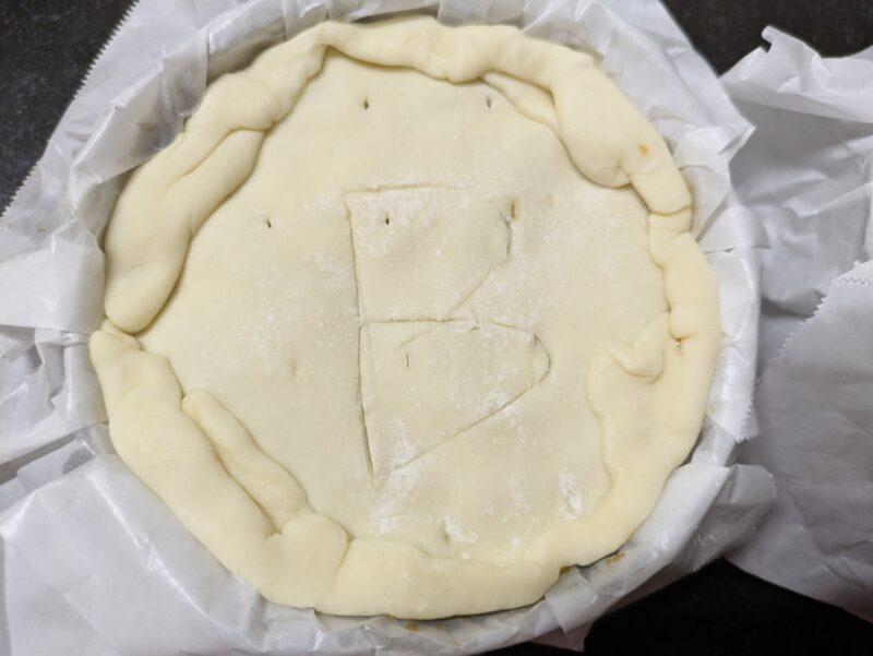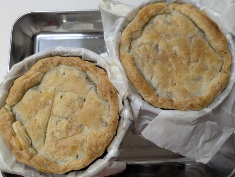 型に合わせてパイ生地をのばし、上からかぶせる。180℃のオーブンで約25〜30分、こんがり色づくまで焼く。