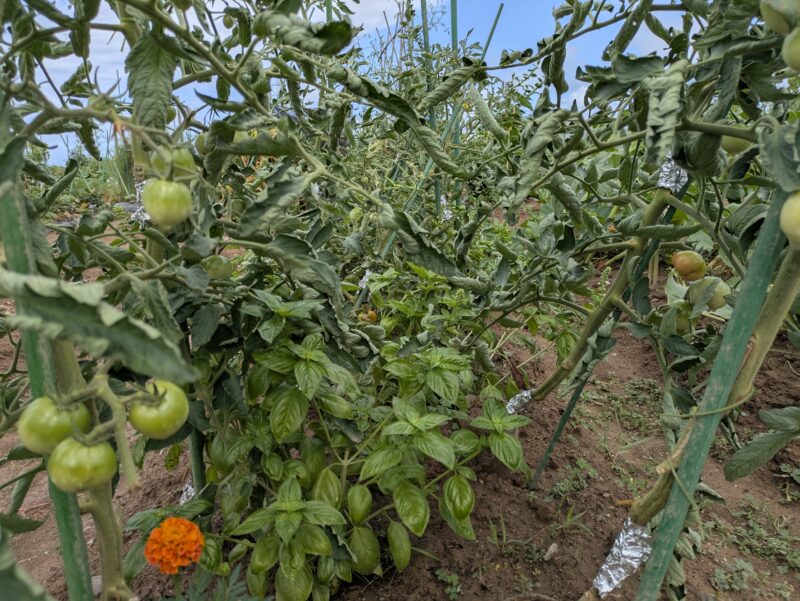 トマトも一部、支柱とともに斜めに倒れ掛かっていました。