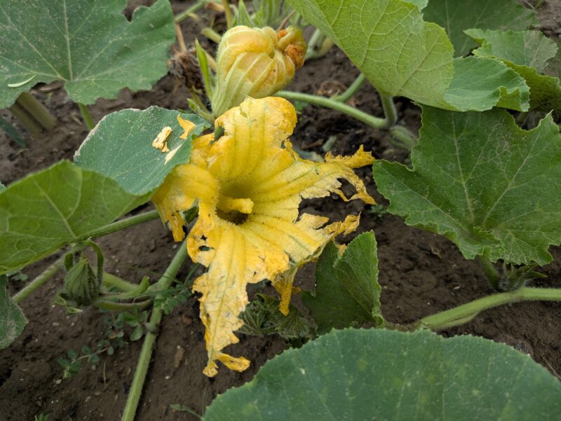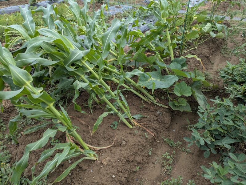 うちのトウモロコシは倒れているだけだったので、縦に戻してあげればいいのですが、根本からかボキッと数本折れている畑もありました。