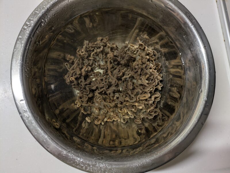 1.干しぜんまいを人肌程度のお湯に5分ほど浸け、少し柔らかくします。