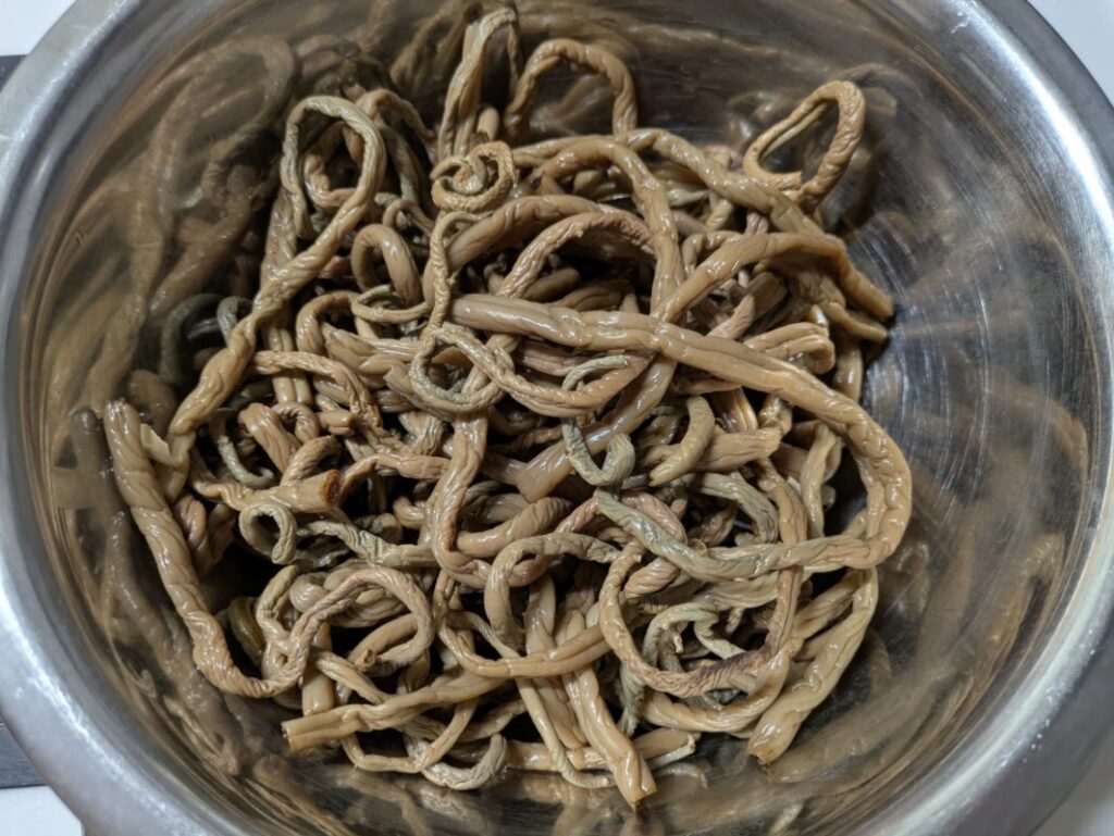 2.60℃ほどのお湯に浸し、冷めるまで置いてアクを抜きます。これを3~4回繰り返します。